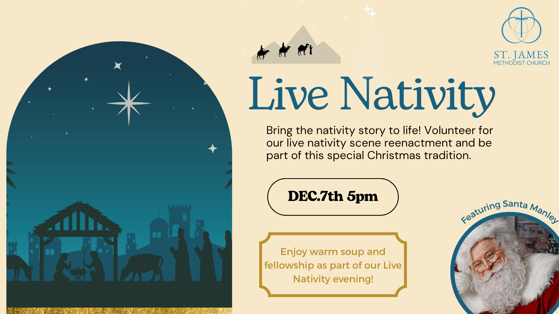 Experience the wonder of Christmas at St. James on Dec. 7th at 5:00 p.m. we will have our annual Live Nativity which will include a beautiful outdoor celebration of the birth of Jesus, complete with costumed character, live animals, and the true story of Christmas brought to life. Bring your family and friends to enjoy dinner, hot cocoa, carols, and the magic of the manger. Santa Manley will be joining us for a complimentary “Picture with Santa.”