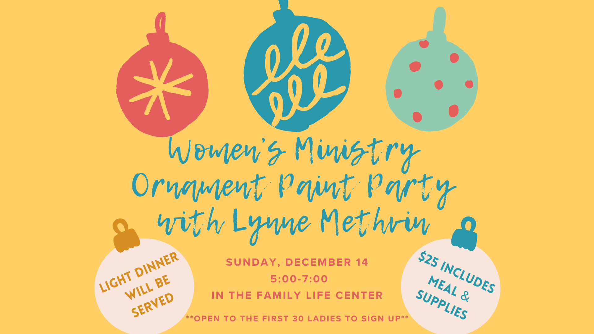 Join us for a festive evening of creativity and connection at our Ornament Paint Party! The first 30 ladies to sign up will enjoy a delightful light dinner, all for just $25, which includes your meal and all painting supplies.